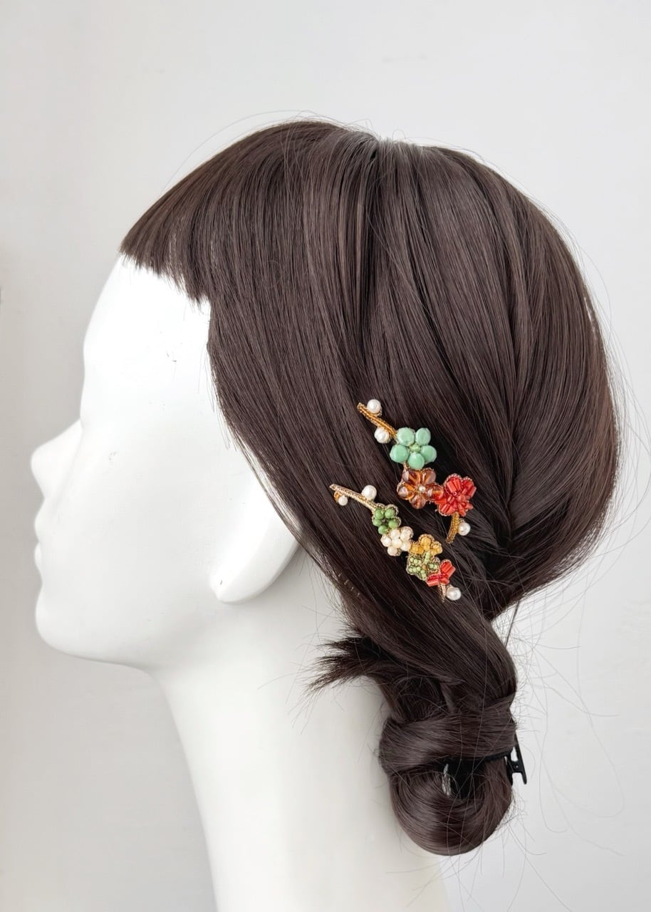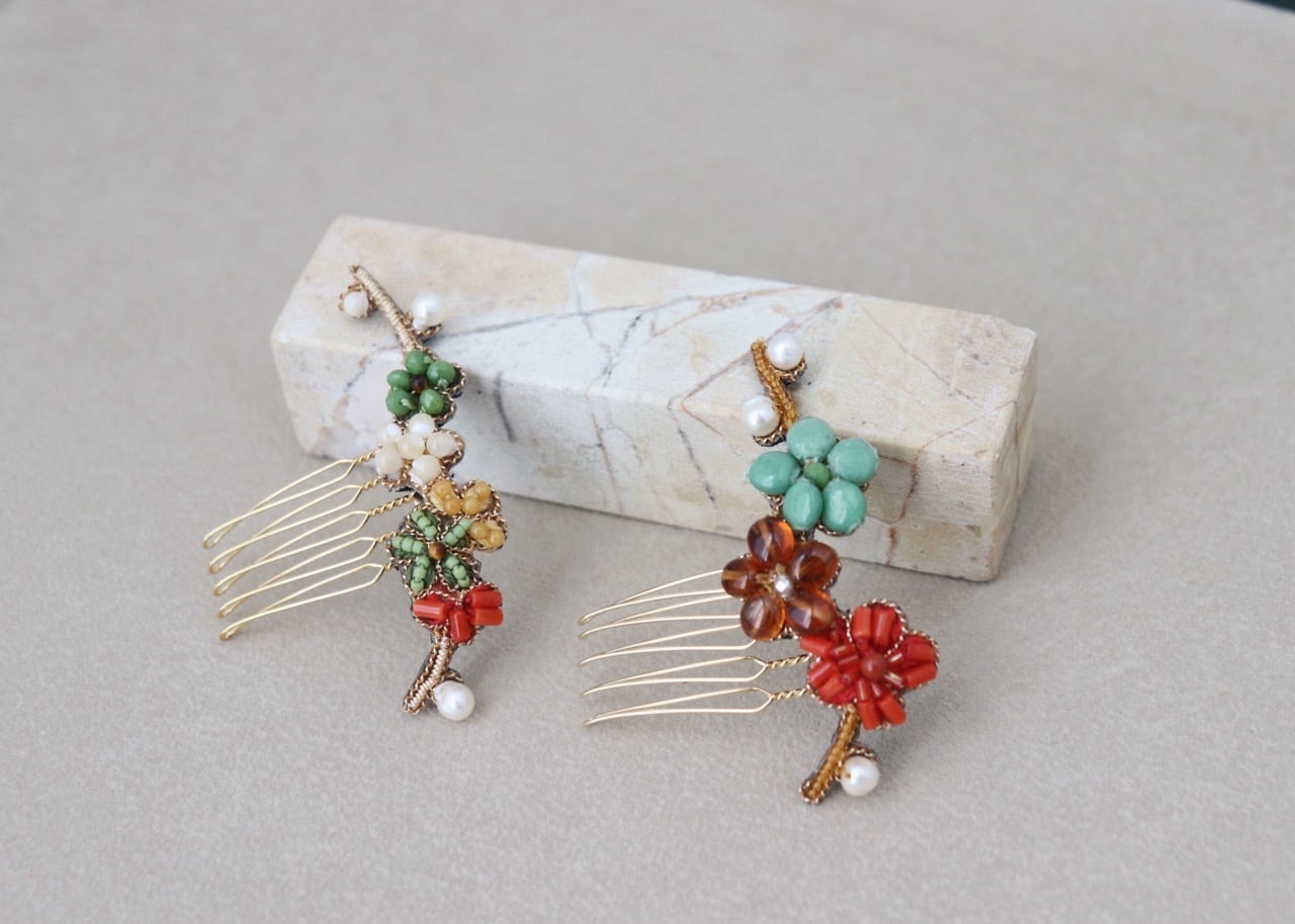 オーダー頂きました天然石とフランスヴィンテージビーズで制作した梅の枝髪飾り2点です。